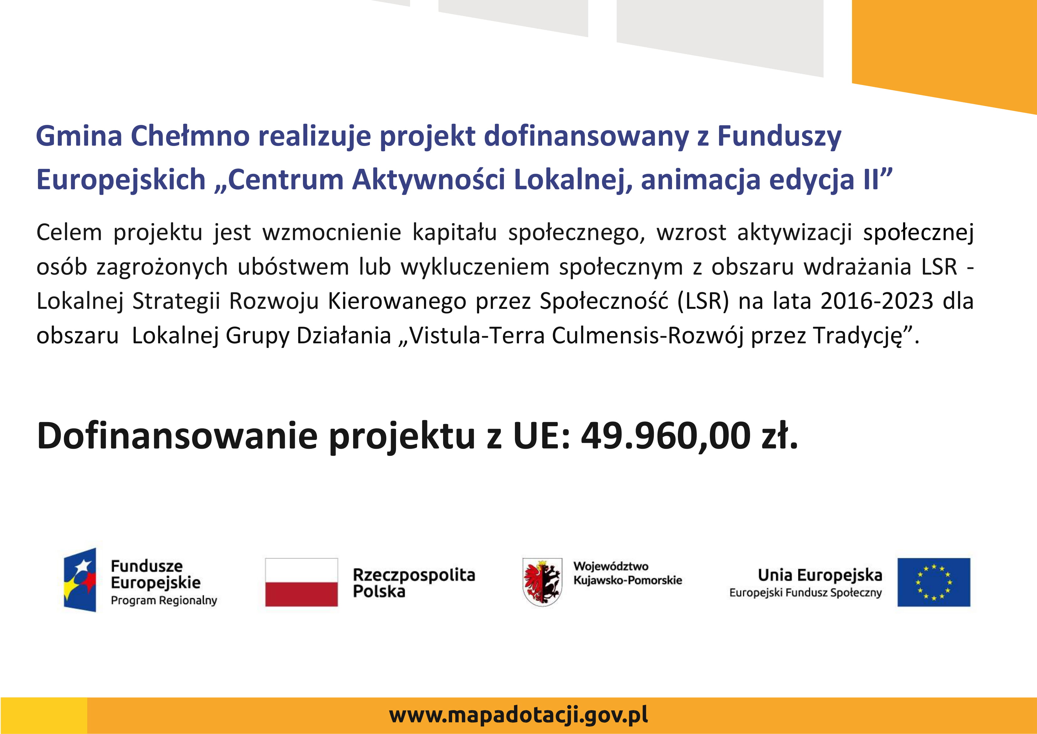 Projekt pt: ”Centrum Aktywności Lokalnej, animacja edycja II”, nr zawartej umowy z LGD „Vistula-Terra Culmensis” 42/G z dnia 28.05.2021 r. współfinansowany jest ze środków Unii Europejskiej z Europejskiego Funduszu Społecznego w ramach Regionalnego Programu Operacyjnego Województwa Kujawsko - Pomorskiego na lata 2014-202 w ramach Osi Priorytetowej 11, Działania: 11.1 Włączenie społeczne na obszarach objętych LSR – środki Europejskiego Funduszu Społecznego.