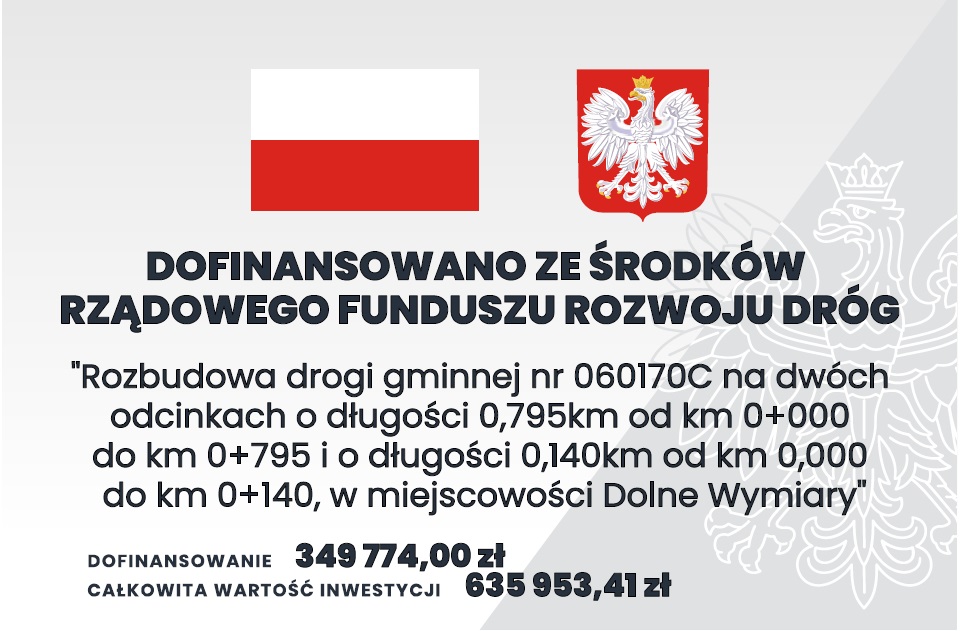 „Rozbudowa drogi gminnej nr 060170C na dwóch odcinkach o długości 0,795 km od km 0+000 do km 0+795 i o długości 0,140 km od km 0,000 do km 0+140, w miejscowości Dolne Wymiary”