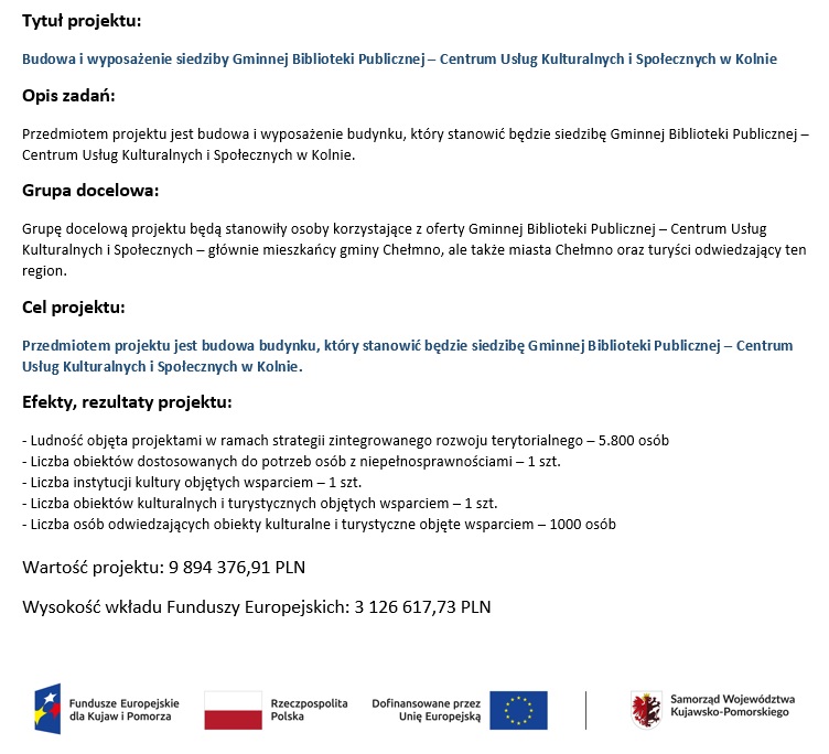 Budowa i wyposażenie siedziby Gminnej Biblioteki Publicznej – Centrum Usług Kulturalnych i Społecznych w Kolnie