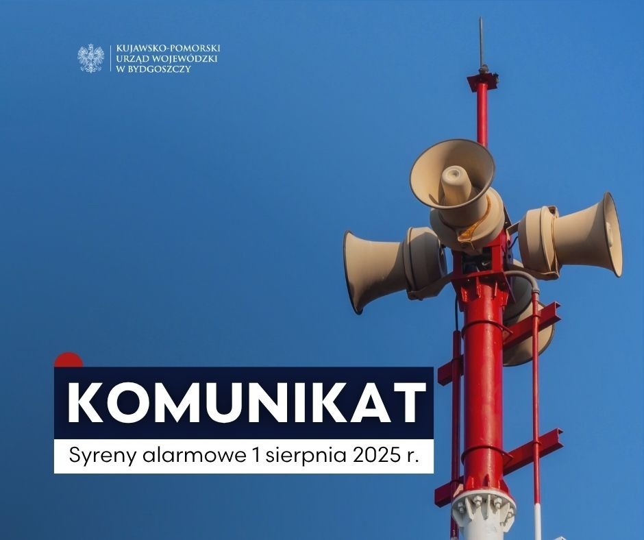 Wójt Gminy Chełmno informuje, iż w dniu 1 sierpnia 2025 roku o godz. 17.00 na terenie całej gminy zostaną uruchomione syreny alarmowe – sygnał ciągły na okres 1 minuty.